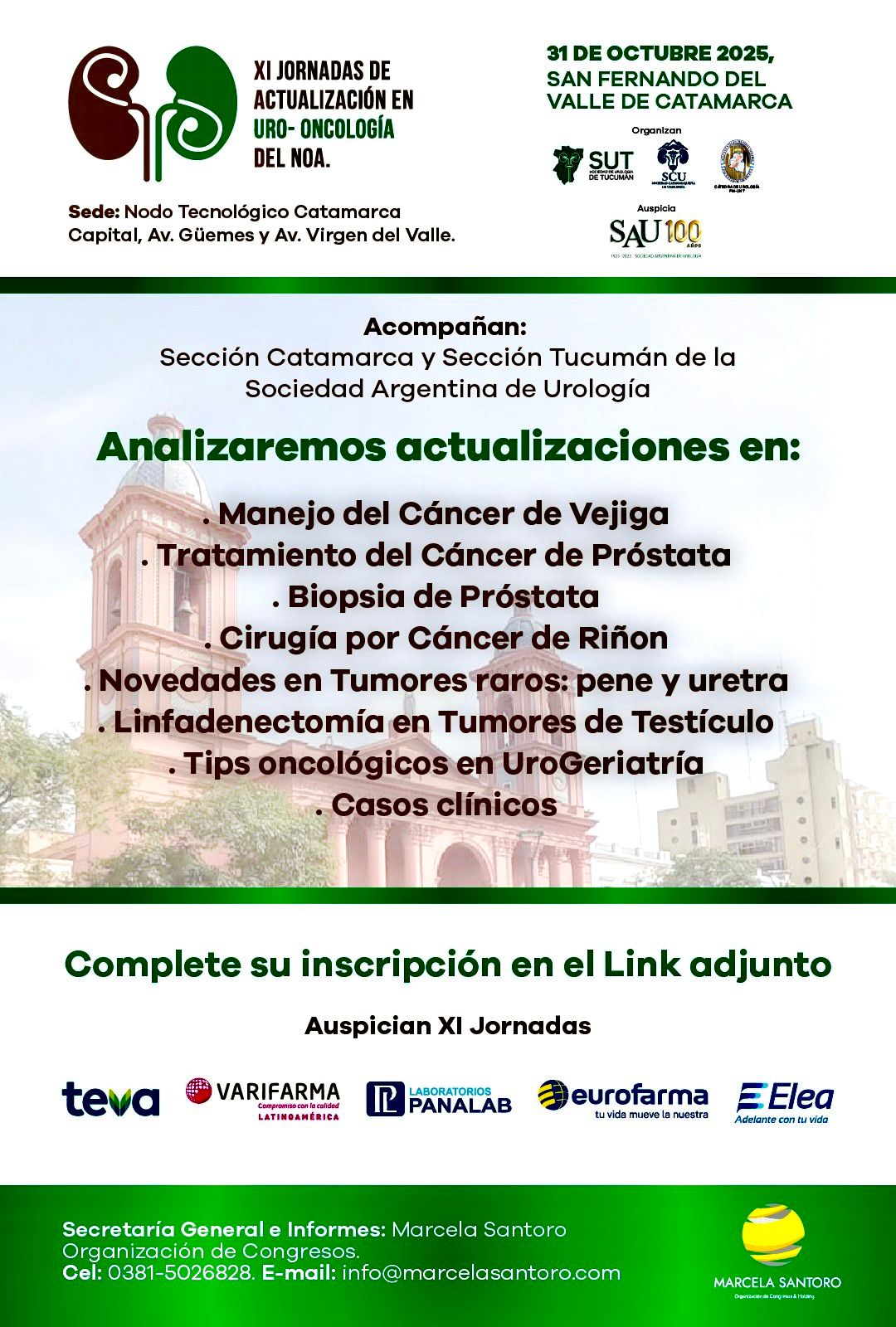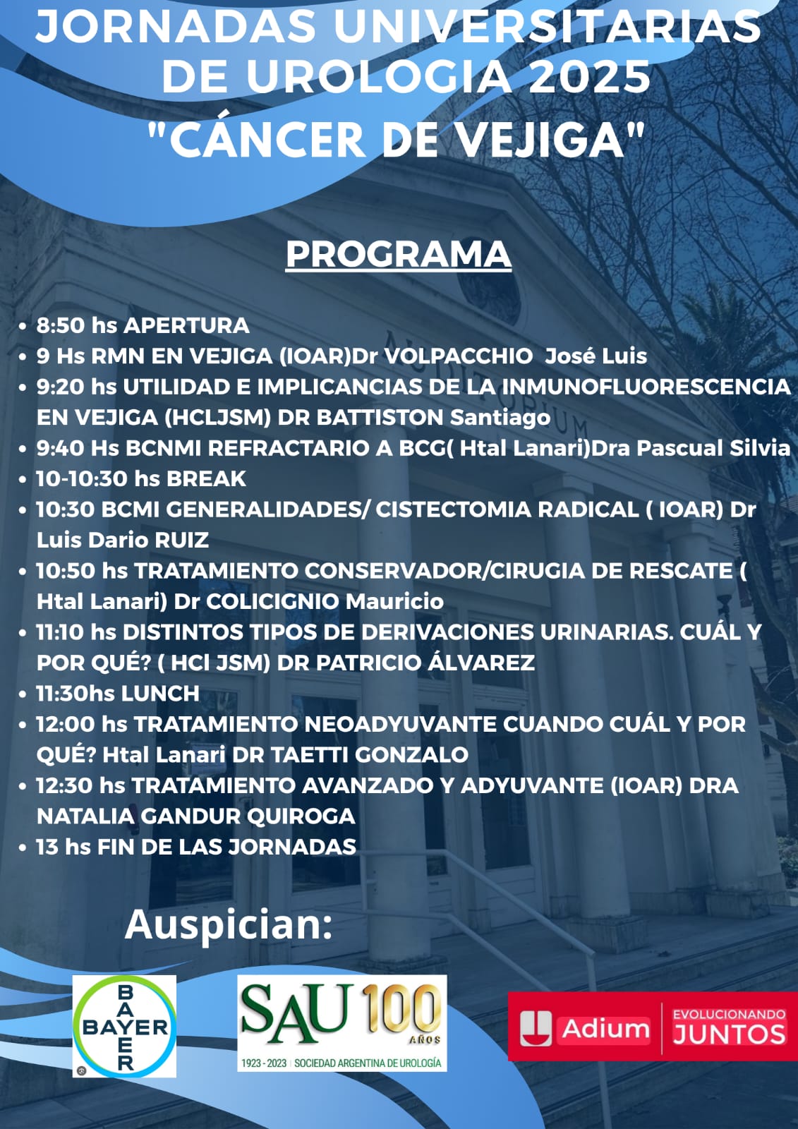 Agenda CientíficaMatrícula abiertaCurso de Cáncer de Próstata Virtual. Organizado por la Academia Nacional de Medicina de Buenos Aires y la Sociedad Argentina de Urología (SAU). Carga horaria: 57 créditos / 19hs. Con evaluación. Curso de matrícula abierta, comienza en el momento de la inscripción y se dispone de 4 meses para finalizarlo. Informes e inscripción: anm.edu.ar/curso-de-cancer-de-prostata/. Matrícula abiertaCurso de Cáncer de Vejiga Virtual. Organizado por la Academia Nacional de Medicina de Buenos Aires y la Sociedad Argentina de Urología (SAU). Carga horaria: 48 créditos / 16hs. Con evaluación. Curso de matrícula abierta, comienza en el momento de la inscripción y se dispone de 4 meses para finalizarlo. Informes e inscripción: anm.edu.ar/curso-de-cancer-de-vejiga/. 2 y 3 de octubre de 2025Curso de Laparoscopia Urológica para Residentes Hospital de Clínicas “José de San Martín”, Buenos Aires. Organizado por el Capítulo de Cirugía Laparoscópica de la SAU. Auspiciado por la Sociedad Argentina de Urología (SAU). Vacantes limitadas. No arancelado. Inscripciones: cursolaparoscopiaurologica@gmail.com. 4 de octubre de 2025Segunda Jornada de Sexología de ASAR Aula Magna de la Facultad de Medicina de la Uninversidad de Buenos Aires. Organizada por la Asociación Sexológica Argentina (ASAR). Auspiciada por la Sociedad Argentina de Urología (SAU). Bajo el título "La sexología en la medicina y en la psicología. La medicación en la terapia sexual." Informes: secretaria.asar@gmail.com. Programa de entrenamiento continuo de habilidades quirúrgicas laparoscópicas 2025 / 2026Hospital Universitario, Mendoza. Organizado por el Centro de Entrenamiento Laparoscópico del Hospital Universitario y el Centro de Entrenamiento Veress. Auspiciado por la Sociedad Argentina de Urología (SAU). Curso de posgrado. Módulos distribuidos con actividades teóricas (20%) y prácticas (80%). Carga horaria total: 90 horas cátedra. Cupos limitados. Informes: veressnavena@gmail.com. 31 de octubre de 2025II Jornada de Simulación para Residentes de Urología. Enfoque en el Cáncer de Próstata: Abordaje Mini-Invasivo y Perspectiva Oncológica Hospital Cuenca Alta, Cañuelas. Organizado por el Servicio de Urología del Hospital de Alta Complejidad Cuenca Alta “Néstor Kirchner”. Auspiciado por la Sociedad Argentina de Urología (SAU). Informes e inscripción cuencaaltaurologia@gmail.com. 31 de octubre de 2025XI Jornadas de Actualización en Uro-Oncología del NOA Nodo Tecnológico Catamarca. Presencial y virtual. Organizadas por la Sociedad de Urología de Tucumán, Sociedad Catamarqueña de Urología y Cátedra de Urología de la Facultad de Medicina de la Universidad Nacional de Tucumán. Auspiciadas por la Sociedad Argentina de Urología (SAU). Informes e inscripción: info@marcelasantoro.com. 7 y 8 de noviembre de 2025Congreso Iberoamericano de Cirugía Robótica. CIBERCIRO 2025. Buenos Aires. Auspiciado por la Sociedad Argentina de Urología (SAU). Arancelado. Cupos limitados. Informes e inscripción: info.tecnoimagen.com.ar/ciberciro_congresoderobotica 12 al 14 de noviembre de 2025UROVIVO 2025. Curso de cirugías en vivo. Hospital de Clínicas “José de San Martín”, Buenos Aires. Organizado por el Servicio de Urología del Hospital de Clínicas. Auspiciado por la Sociedad Argentina de Urología (SAU). Informes e inscripción: urologia@hospitaldeclinicas.uba.ar. 13 y 14 de noviembre de 2025II Jornadas de Uro-Oncología Patagónicas Río Grande. Auspiciadas por la Sociedad Argentina de Urología. Informes e inscripción: 11-5140-9244. 19 al 21 de noviembre de 2025Curso Universitario "HANDS ON" de Cirugía Laparoscópica Urológica (Básica y Avanzada) Corrientes. Organizado por el Centro de Entrenamiento e Investigación en Cirugía Laparoscópica y Mini Invasiva de la Facultad de Medicina de la Universidad Nacional del Nordeste. Auspiciado por la Sociedad Argentina de Urología (SAU). Carga horaria: 36 horas teórico-prácticas. Destinado a médicos especialistas o residentes del último año de la especialidad urología. Arancelado. Cupo: 30 cursantes. Más información. Los organizadores ofrecen una beca para un socio de la SAU para realizar el curso. Requisitos e informes. 26 de noviembre de 2025Tercera Jornada Platense de Uro-oncología Hotel Grand Brizo, La Plata. Organizada por la Asociación Civil Urológica de Buenos Aires (ACUBA), sección local de la Sociedad Argentina de Urología y la Sociedad de Cancerología de La Plata. Auspiciada por la Sociedad Argentina de Urología (SAU). Informes: asociacion@acuba.ar. 27 y 28 de noviembre de 2025I Jornadas de Oncología Genitourinaria de Neuquén y Río Negro Neuquén. Organizadas por la Sociedad de Urología del Comahue (SUC) y la Asociación Patagónica de Radioterapeutas y Oncólogos Clínicos (APROC). Auspiciadas por la Sociedad Argentina de Urología (SAU). Informes: ameliecastro1@yahoo.com.ar. 28 de noviembre de 20251ra Jornada de VIH e ITS de la Sociedad Argentina de Infectología (SADI) Aula Magna, Facultad de Medicina de la UBA, Buenos Aires. Organizada por la Sociedad Argentina de Infectología (SADI). Informes e inscripción: eventos.sadi.org.ar. 28 y 29 de noviembre de 2025XII Reunión Post Congreso Europeo de Oncología Sheraton Hotel, Tucumán. Organizada por la Asociación Argentina de Oncología Clínica (AAOC). Auspiciada por la Sociedad Argentina de Urología (SAU). Informes: www.aaoc.org.ar/post-europeo-2025-tucuman/ 3 al 5 de diciembre de 2025XL Jornadas Nacionales para Médicos Residentes de Urología. XIX Jornadas Latinoamericanas para Médicos Residentes de Urología. Mar del Plata. Organizadas por el Servicio de Urología del Hospital Privado de Comunidad. Auspiciadas por la Sociedad Argentina de Urología (SAU). Informes: jornadasresidentesurologiahpc@gmail.com. 5 de diciembre de 2025Jornadas Universitarias de Urología 2025 "Cáncer de vejiga" Instituto de Oncología A. H. Roffo, Buen