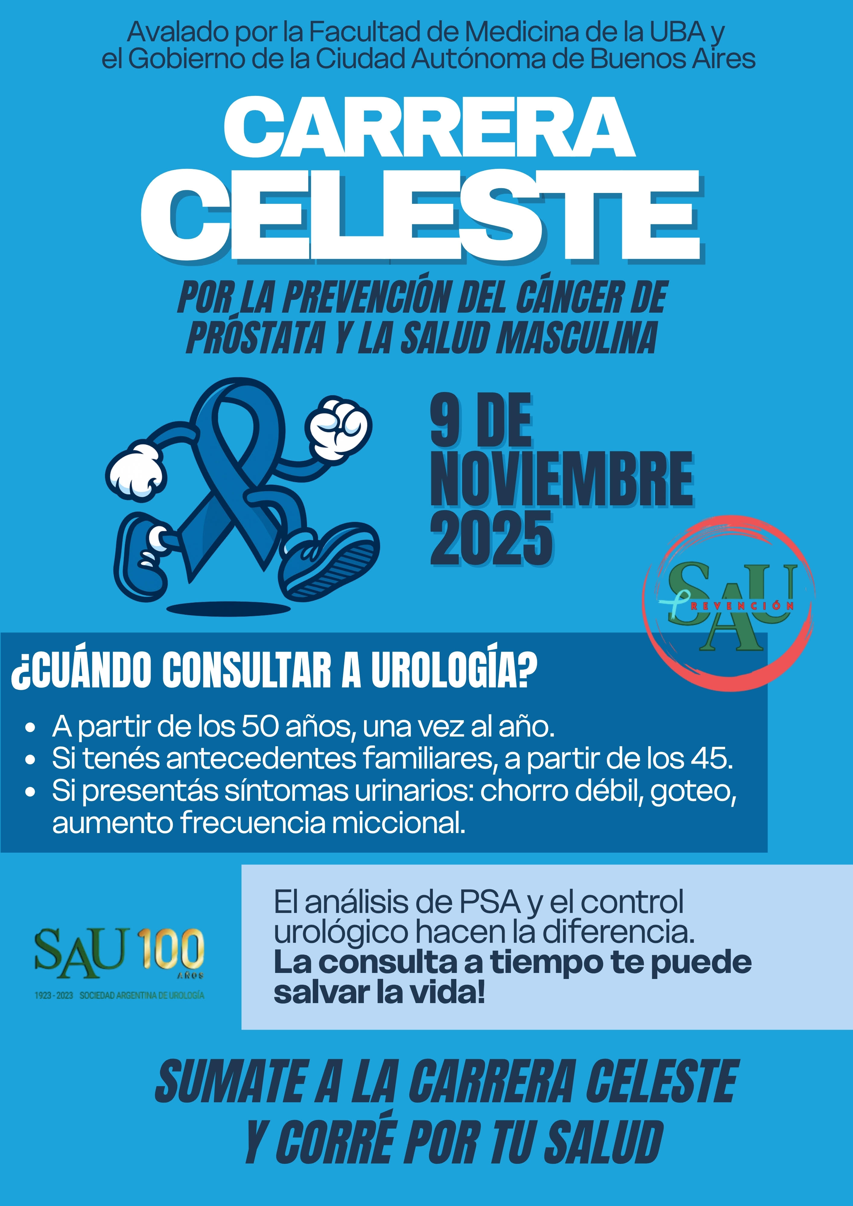Dra. María Sol Rueda Integrantes: Dra. Arbizu Carrera Celeste por la prevención del cáncer de próstata 2025La Sociedad Argentina de Urología (SAU) auspicia la Carrera Celeste, iniciativa orientada a la prevención del cáncer de próstata y al cuidado de la salud masculina, que se realizará el 9 de noviembre de 2025. Impulsada por la Comisión de Prevención y Promoción de la Salud en Urología de la SAU, la acción busca fomentar la consulta oportuna y el acceso a controles urológicos, con participación activa de nuestros profesionales como referentes de la comunidad. Invitamos a acompañar y difundir. |