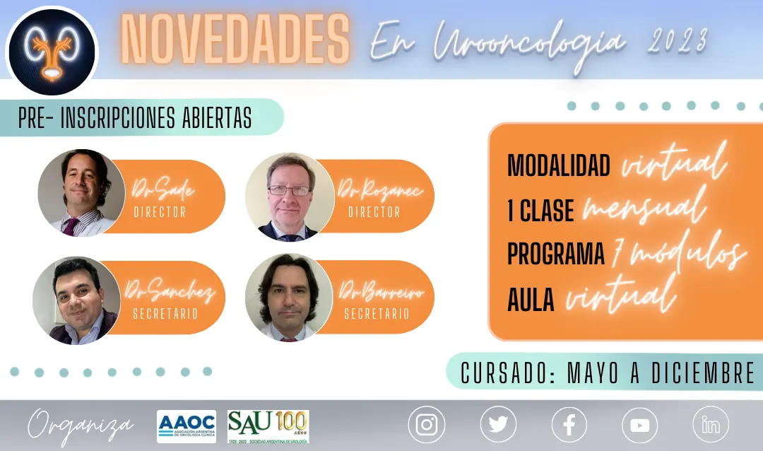 | Mayo a diciembre de 2023 Novedades en urooncología 2023 Virtual. Organizado por la Asociación Argentina de Oncología Clínica (AAOC) y la Sociedad Argentina de Urología (SAU). 7 módulos, una clase por mes. Para conocer los aranceles de inscripción, por favor complete el formulario de preinscripción. Informes: sau@sau-net.org. Flyer |